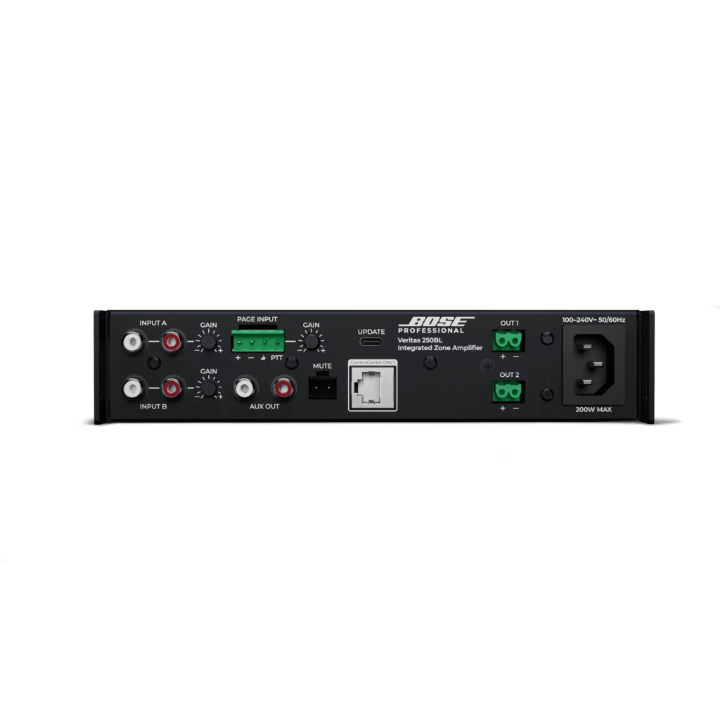 El Veritas 250BL de Bose Professional es un amplificador mezclador inteligente de alta calidad diseñado para aplicaciones comerciales que requieren audio ambiental, música de primer plano y sistemas de voceo. Con tecnología DSP avanzada de 24 bits a 48 kHz, este amplificador compacto de medio rack ofrece 2x50W a 4Ω o 2x25W a 8Ω, conectividad Bluetooth 5.0 integrada y una pantalla OLED intuitiva que simplifica la configuración y operación. Ideal para instalaciones silenciosas gracias a su enfriamiento por convección sin ventilador.