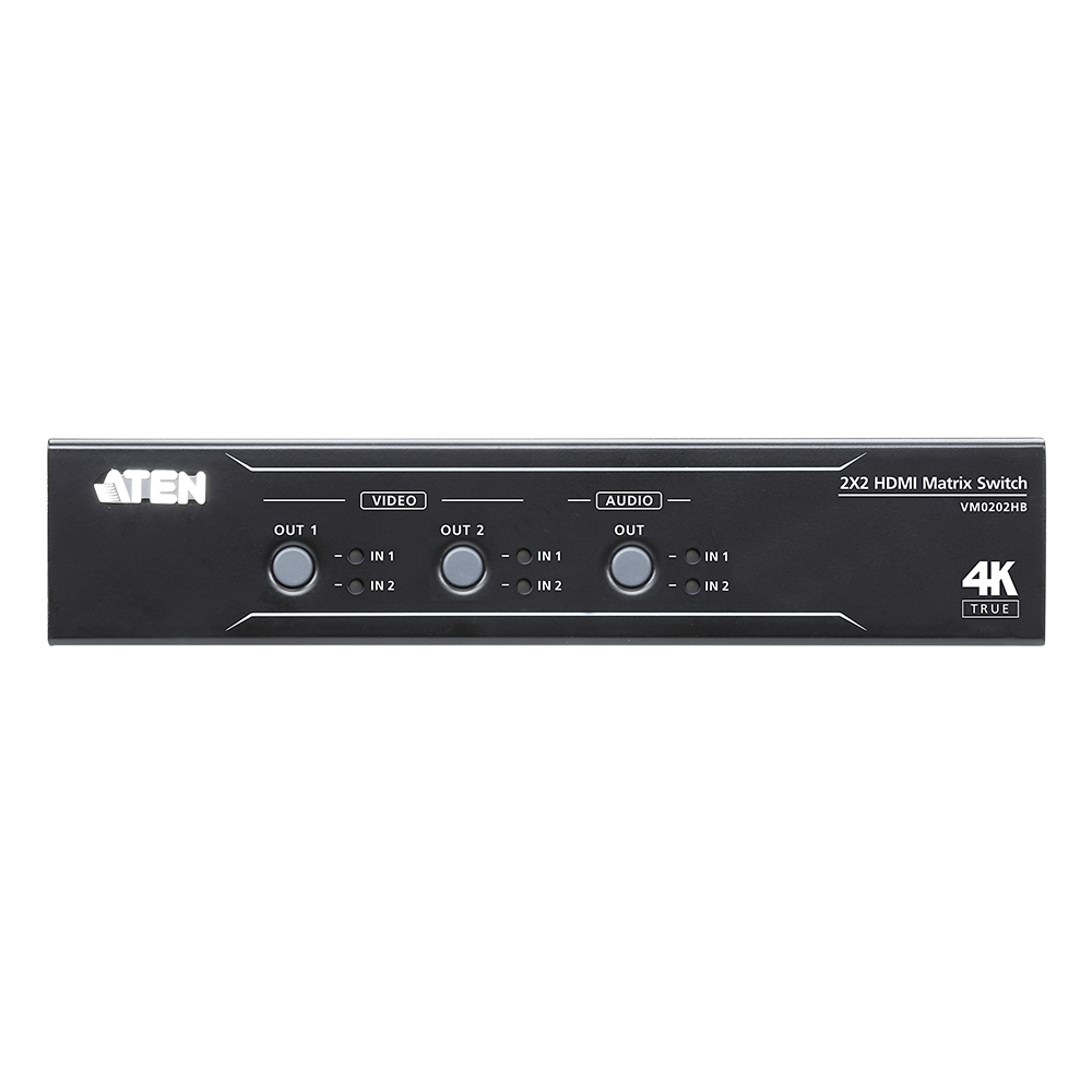 El VM0202HB es un conmutador de matriz compacto de 2 x 2 compatible con dispositivos de visualización y fuente HDMI. Cualquier entrada se puede encaminar a cualquier salida, lo que reduce la necesidad de mover dispositivos o cables al mostrar contenido de diferentes fuentes HDMI en diferentes salidas. Es ideal para salas de reuniones y aulas, así como para cualquier lugar donde necesites cambiar entre 2 fuentes de vídeo diferentes en diferentes pantallas.