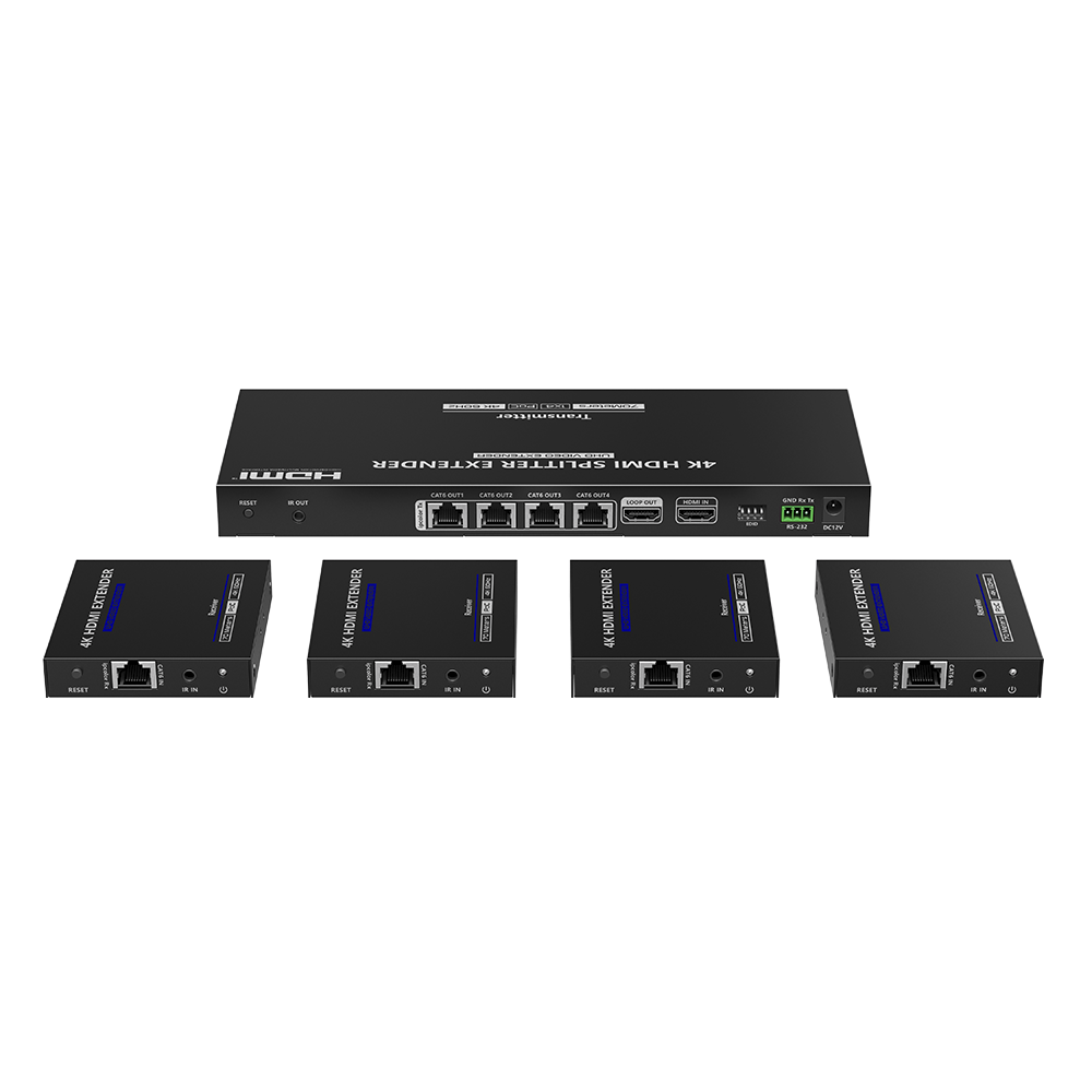 Este producto es un kit divisor extensor de 1 entrada y 4 salidas, que integra las funciones de distribución y extensión. Distribuye 1 Señal de entrada HDMI a 4 salidas de señal idénticas, extiende estas señales hasta 70 metros y admite resolución 4K60Hz. También es compatible Passback IR bidireccional, control RS-232 y otras funciones. Está adecuado para estudios, aulas multimedia, tránsito ferroviario, etc.