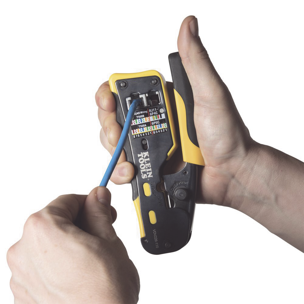 - Poncha conectores modulares de 4, 6 y 8 posiciones (conectores estándar RJ11/RJ12 y conectores RJ45 Pass-Thru™ de Klein Tools)