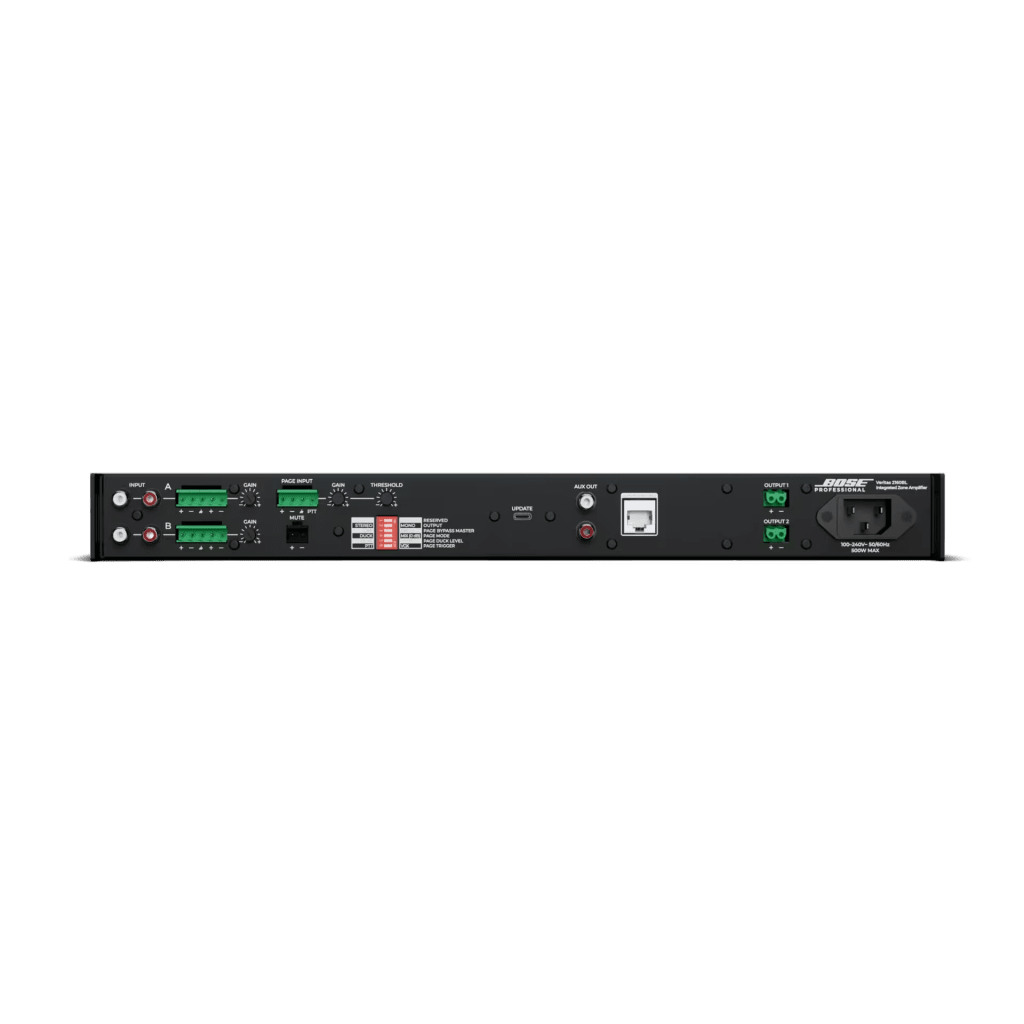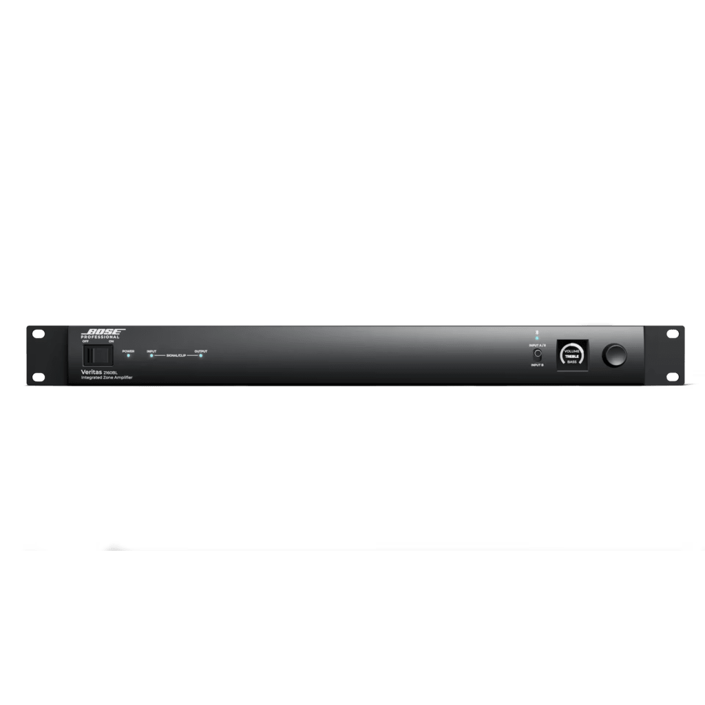 El Veritas 2160BL de Bose Professional es un amplificador mezclador inteligente de alta gama diseñado para aplicaciones comerciales que requieren audio de calidad superior para música ambiental, primer plano, voceo y multimedia. Con una potencia de salida de 2x160W a 4Ω, este amplificador incorpora DSP avanzado de 24 bits a 48 kHz, conectividad Bluetooth 5.0 y una pantalla OLED intuitiva con código QR para simplificar la instalación. Ideal para integradores que necesitan un sistema de alto rendimiento sin la complejidad de sistemas de 70V/100V.