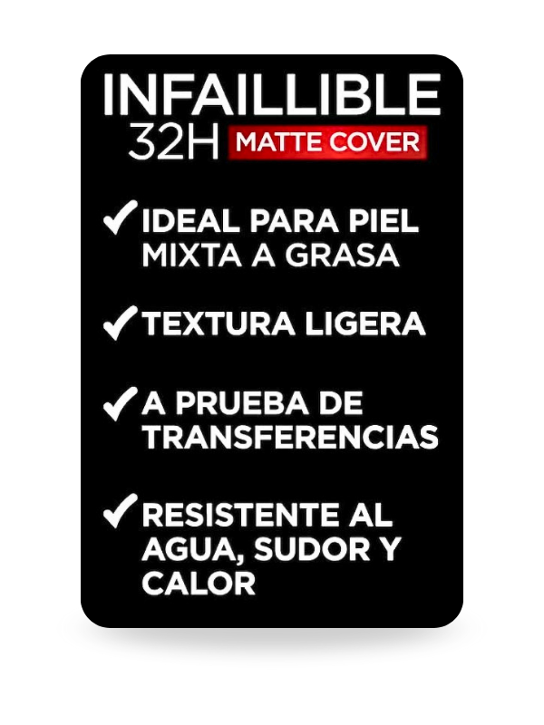La base Infallible 32H Matte Cover de L’Oréal Paris es una solución confiable para quienes buscan un maquillaje de alto rendimiento, con excelente cobertura, acabado mate duradero y una apariencia uniforme durante largas jornadas. Combina tecnología cosmética avanzada con comodidad y resultados profesionales.