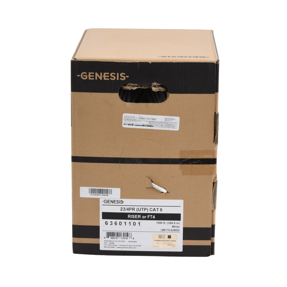 - Impresión en cubierta: GENESIS P/N 6360 4PR23 CAT 6 E175104-1 (UL) CMR C(UL)US FT4 SUN RES 75C (RoHS)