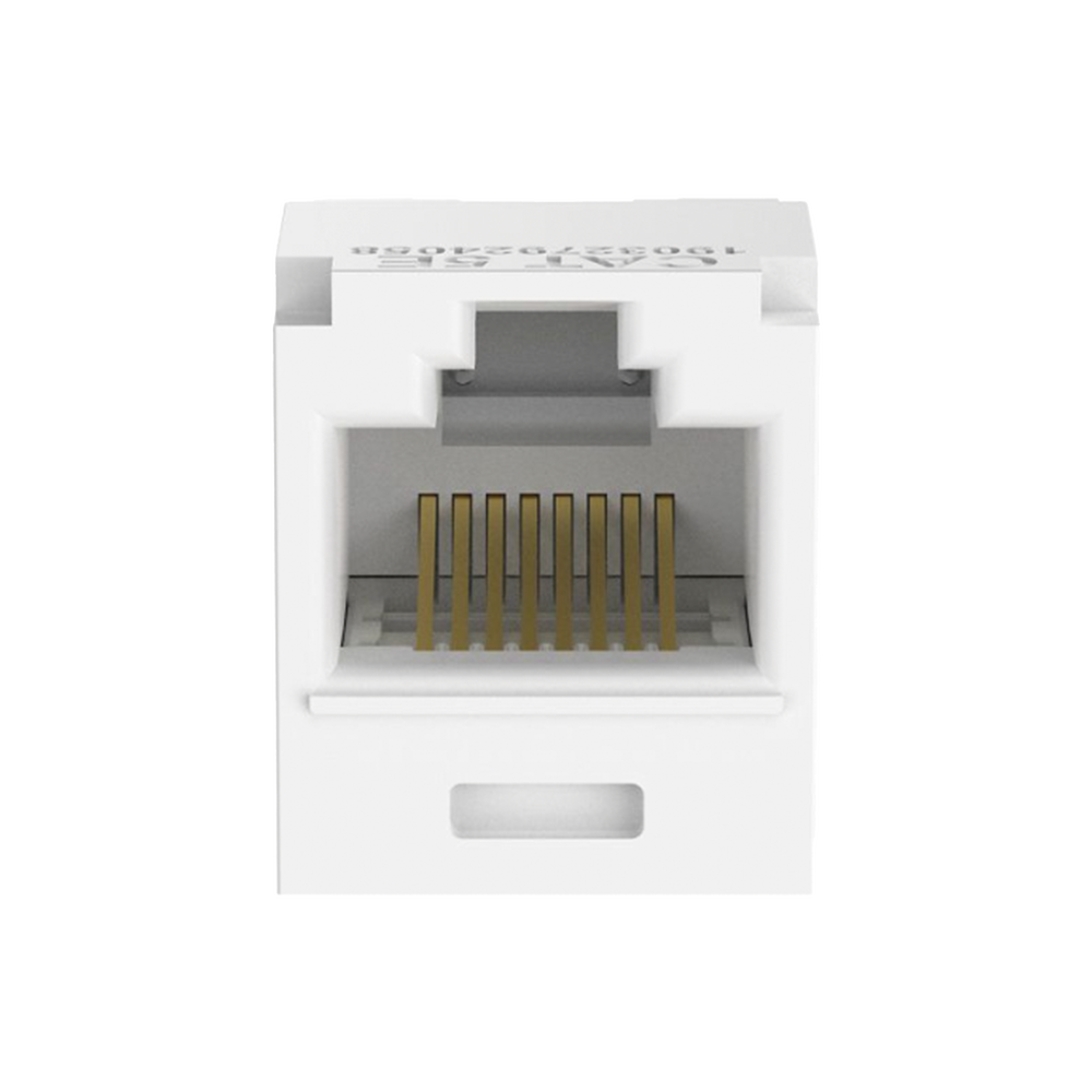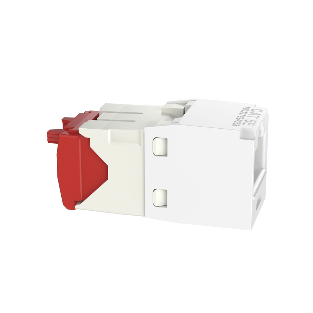 El módulo de conector UTP Categoría 5e/Clase D de 8 posiciones, se termina en cable de 4 pares 22 – 24 AWG de par trenzado sin blindaje de 100 ohms y no requiere el uso de una herramienta de impacto. Los módulos de conector UTP usan un método de terminación de movimiento hacia adelante para optimizar el rendimiento al mantener la geometría del par de cables mientras se elimina el destrenzado del conductor. La tapa de terminación esta codificada por color blanco para designar el rendimiento de la Categoría 6 e incluye una etiqueta universal codificada para los esquemas de cableado T568A y T568B.
